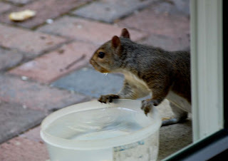 Oh, this was earlier, one of the seven squirrels in the yard, had looked through the patio doors impatiently, then waited for me next to the feed can.
